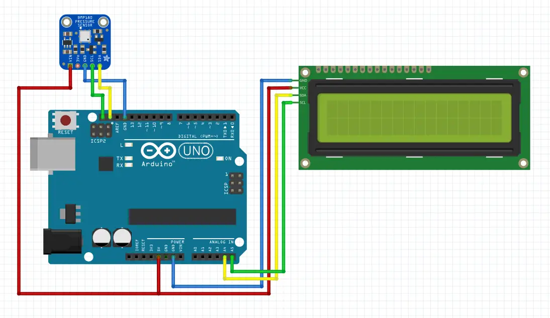Because both the LCD and the pressure sensor use the I2C, we have to connect the pins SDA and SCL to the analog pins 4 and 5.